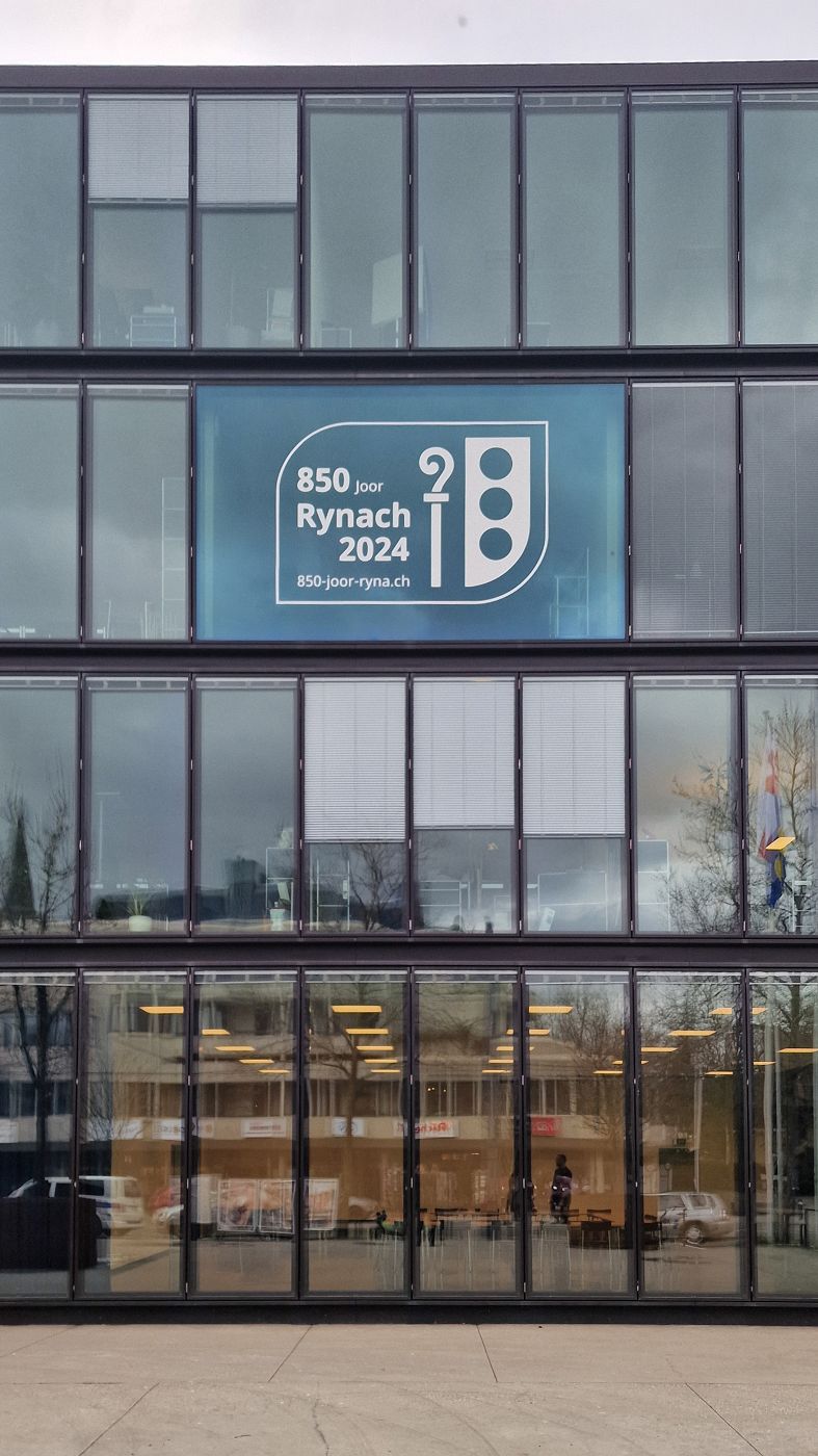 Hier einige Fotos vom Gemeindehaus Reinach, welches mit den von mir gestalteten Logos vom Jubiläumsjahr «850 Joor Rynach», dem Slogan «Rynach goht ab» zusammen mit dem QR-Code und dem Logo vom Rynach Fescht in meinem Layout durch die Cordag AG im März 2024 beklebt wurde.